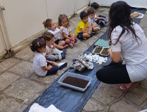 Para isto, o "tapete” foi preparado com folhas secas, galhos, algodão, terra, areia, caixa de ovos, argila, jornal, pedra de rio, pedra expandida de argila, brita e água.